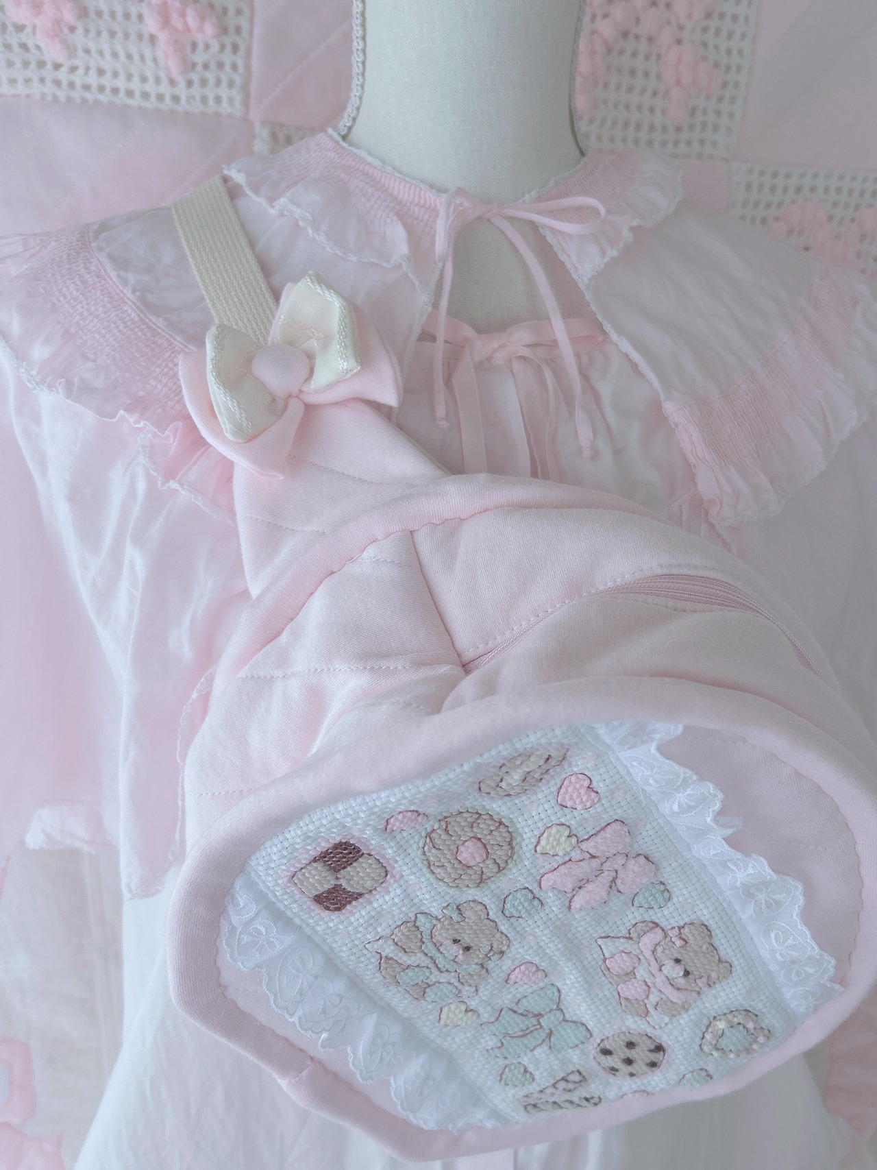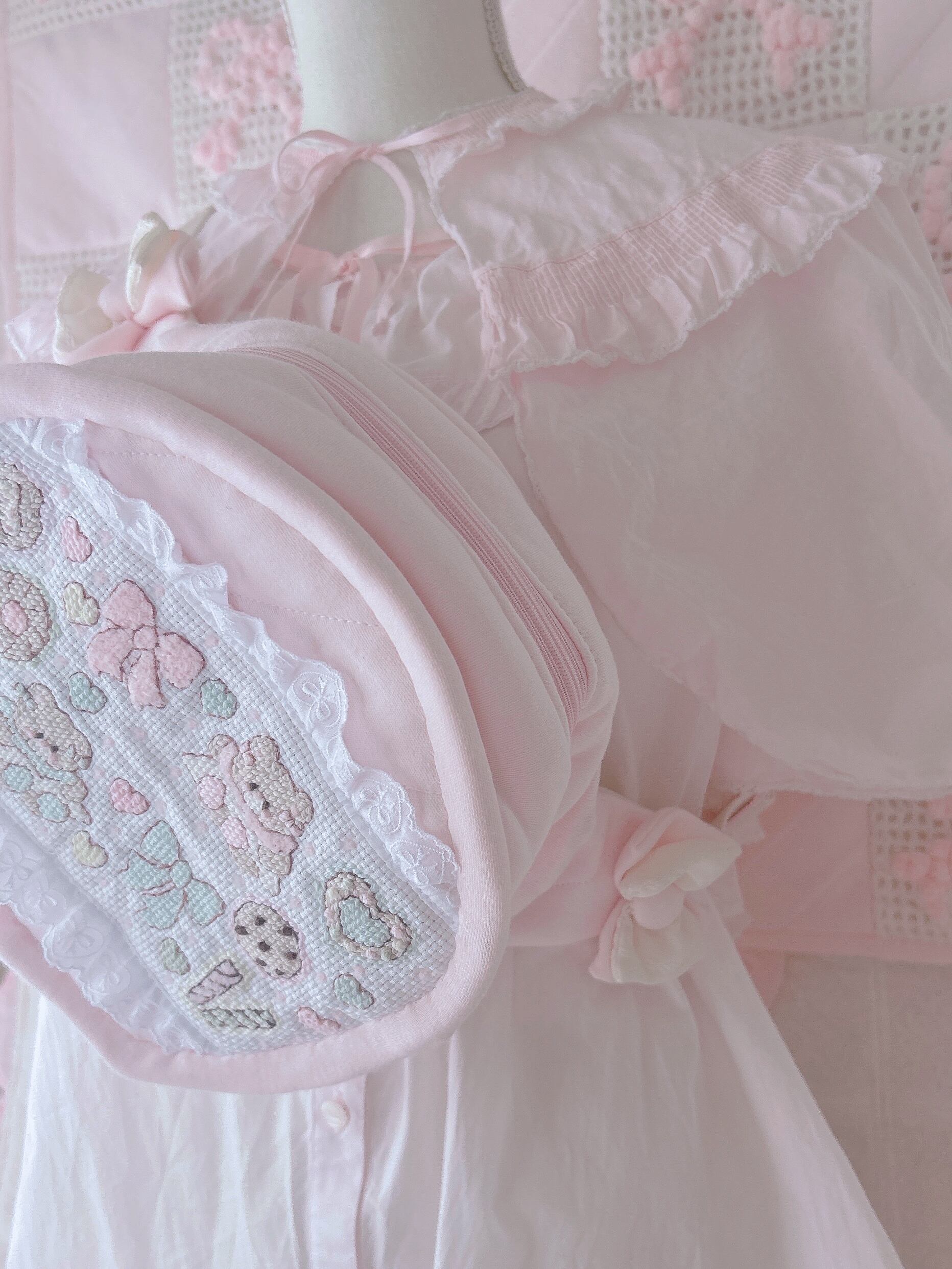 刺繍のデザインに合うようにピンクの生地にはストライプステッチを施し、ツインリボンでおめかししております。