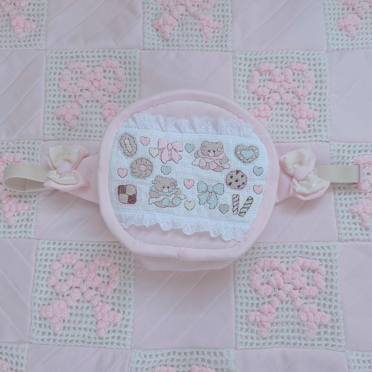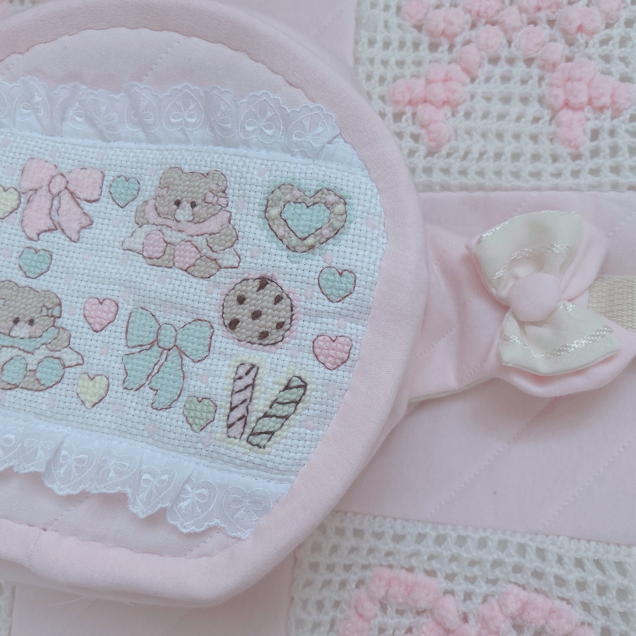 見どころは特に、くまちゃんとクッキー柄の手縫い刺繍です♡マッチして本当にかわいいです♪カラー配色から糸の太さ選びなどこだわりながら製作しております。
