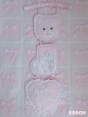 りぼんらしさを出すために周りを布テープで囲ったり、連結させるリボンは毛糸で編んだものを使っております。
